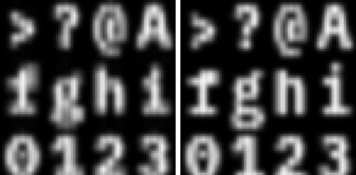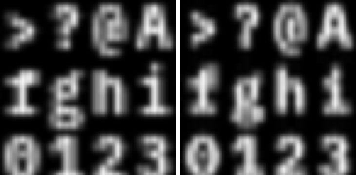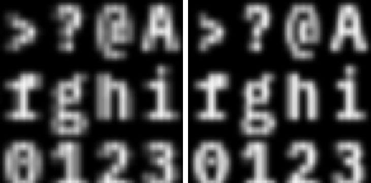 So instead of generating character cells that are 6x9 pixels, in this scheme they need to be 18x9. My initial approach was to generate a 18x27 glyph for each character, then squeeze them vertically to make 18x9 glyphs. Simple enough. This is the result. Original pure cells on the left, attempt at subpixel rendering on the right.
