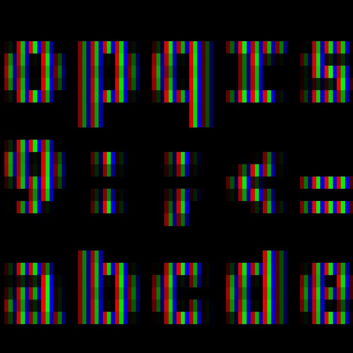 For white text like this, each RGB triple has the same brightness for all three emitters. Subpixel rendering is an long-used technique for increasing text resolution. All you do is consider each emitter element as a pixel. So this would effectively increase the screen resolution from 240x240 to 720x240. It gets you a lot more horizontal resolution, apparently for free. There must be a catch, right? There is, and I’ll talk about it later.