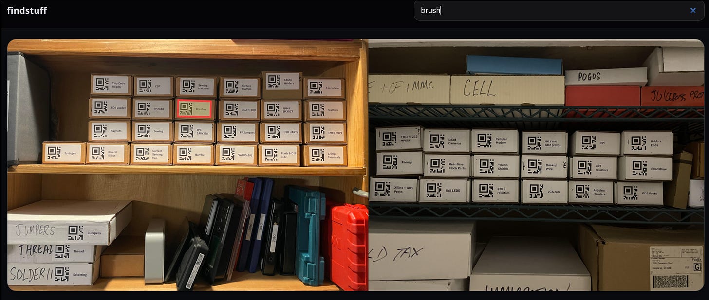 making some software to make a physical search engine. The goal is to type “metric” (for example) and be shown the locations of boxes with “metric” on the label.